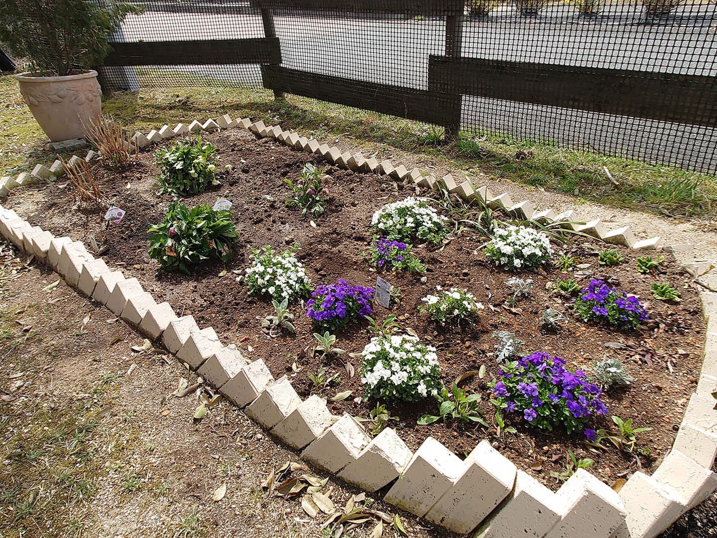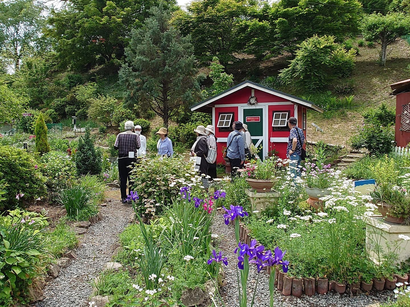 しょうばら花会議の庭花部会では、月に1回、国営備北丘陵公園内のログハウス周辺での新しい花修景としての花壇作りや、会員相互の情報交換・ガーデニングの技術向上を目的に活動を行っています。