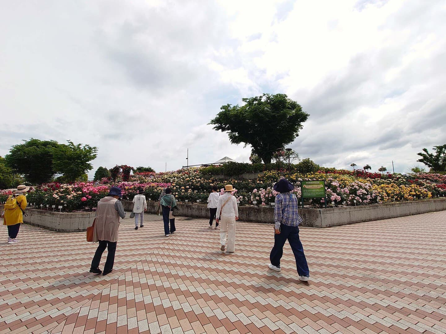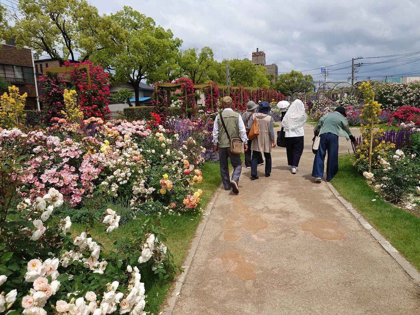 当日、第20回世界バラ会議福山大会 2025開催中の「ばら公園」と「緑町公園」は、多くのお客様で賑わっていました。バラの香りの中で、様々な品種のバラを見学しました。「この花がこう植えてあるのは良いね!」などの声も飛び交い、自分のお庭に応用できる沢山のヒントやアイディアを得ることができました。