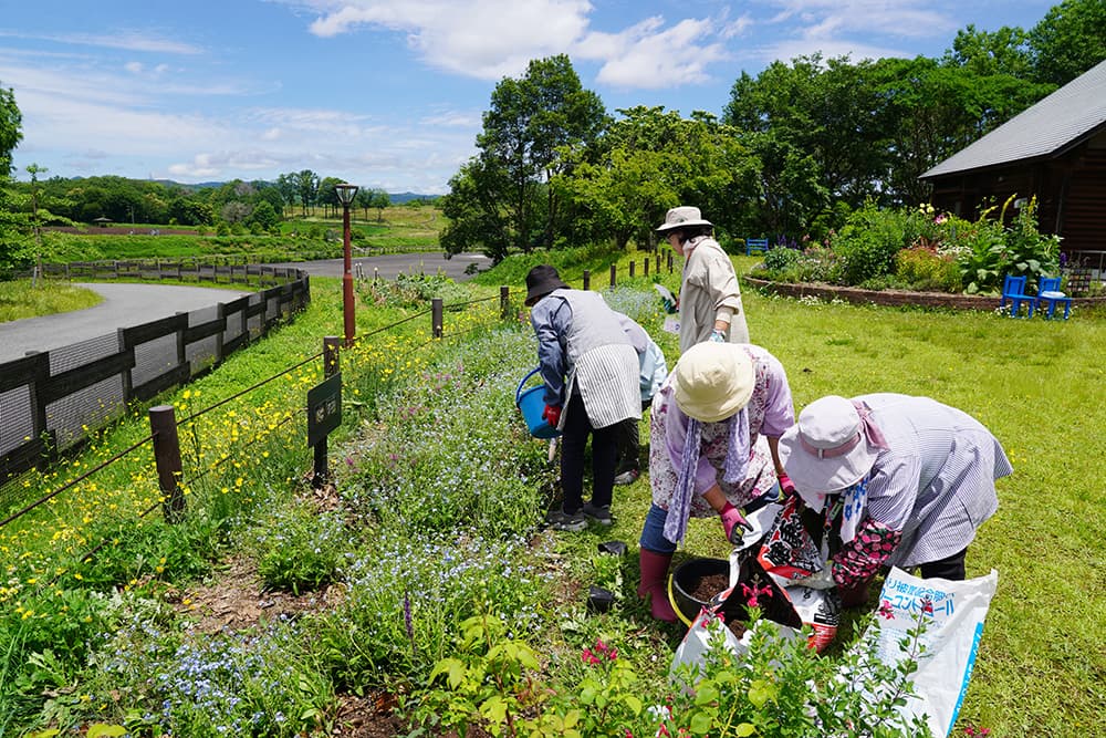 備北丘陵公園内 里山の駅 庄原ふらり 敷地内に造園された ローズガーデンの花の植栽管理に、竹内さん•堤さんを中心にしょうばら花会議のメンバーがボランティアで参加しました。
